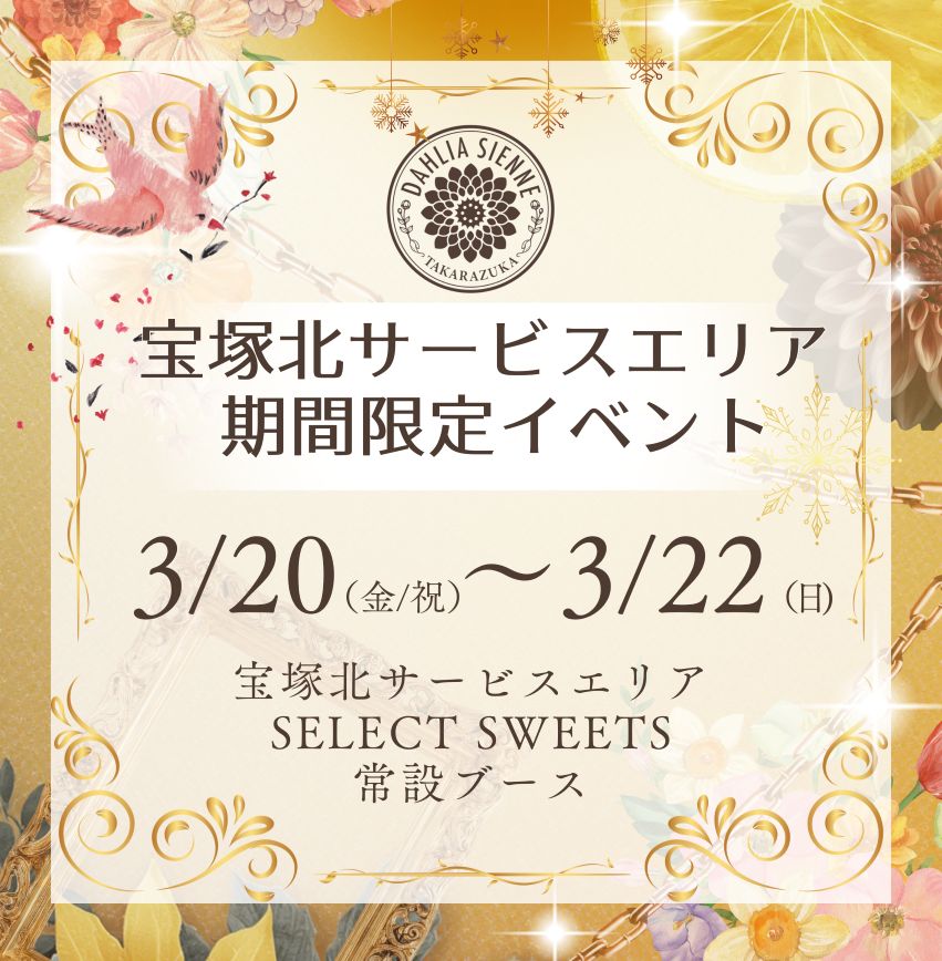 宝塚北SA 3/20(金/祝)~3/22(日) 期間限定イベント!! POP UP イベント お知らせ 2026年03月12日 春休みに先駆けて、春分の日からの3連休イベントになります 𝐏𝐎𝐏 𝐔𝐏 𝐒𝐇𝐎𝐏『ダリアジェンヌin宝塚北サービスエリア』日時: 3月20日(金・祝)〜22日(日)10:00〜16:00 ※館内24時間営業場所: 宝塚北サービスエリア SELECT SWEETS常設ブース内にて 皆さまのお越しをお待ちしています